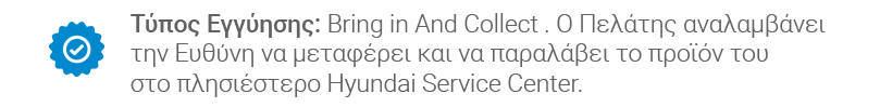 1. Για συσκευές που δεν μπορούν να μεταφερθούν από ένα επιβατικό αυτοκίνητο ή συσκευές με σταθερή εγκατάσταση όπως ψυγεία, πλυντήρια κλπ η επισκευή πραγματοποιείται στον χώρο του πελάτη χωρίς καμία επιβάρυνση. Επίσης χωρίς καμία επιβάρυνση η συσκευή θα μεταφερθεί σε εξουσιοδοτημένο Hyundai Service Center σε περίπτωση που οι συνθήκες το κρίνουν απαραίτητο.