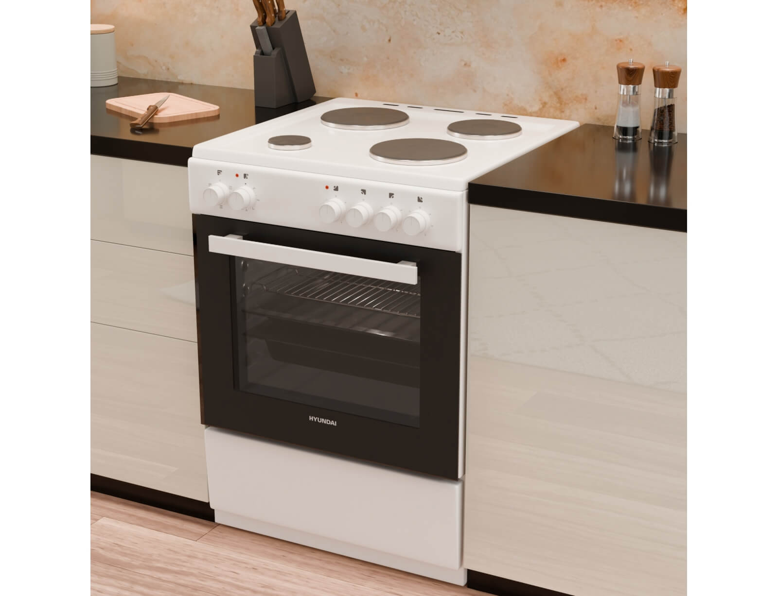 Κουζίνα Hyundai HCMU24V-7260ES/W με πολυλειτουργικό φούρνο, χωρητικότητα φούρνου 72 λίτρα, ενεργειακή κλάση Α, 4 εμαγιέ εστίες μαγειρέματος και 5 λειτουργίες ψησίματος.