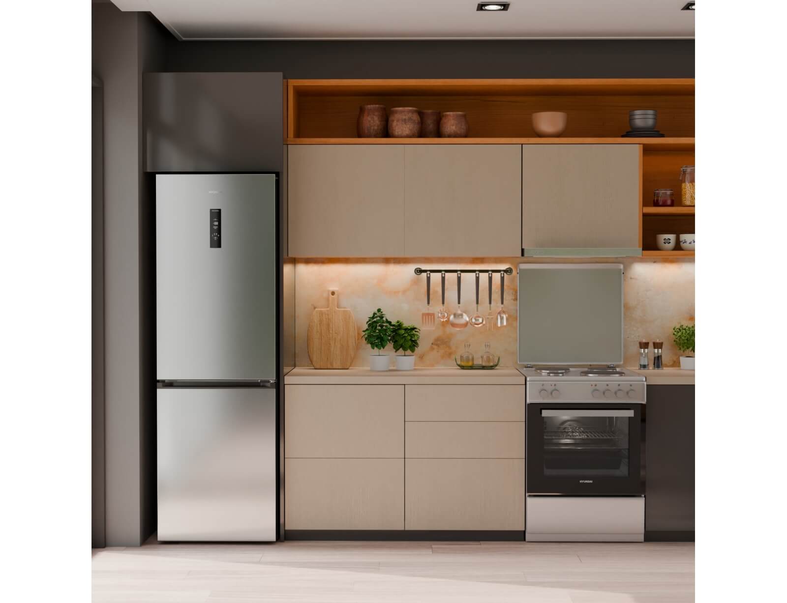 Κουζίνα Hyundai HCMU24V-7260E/S με ηλεκτρικό φούρνο, χωρητικότητα φούρνου 69 λίτρα, ενεργειακή κλάση Α, 4 εμαγιέ εστίες μαγειρέματος και 5 λειτουργίες ψησίματος.