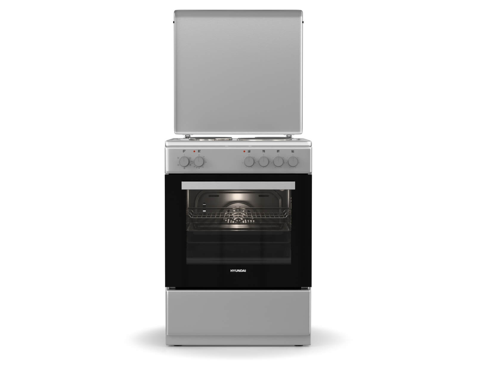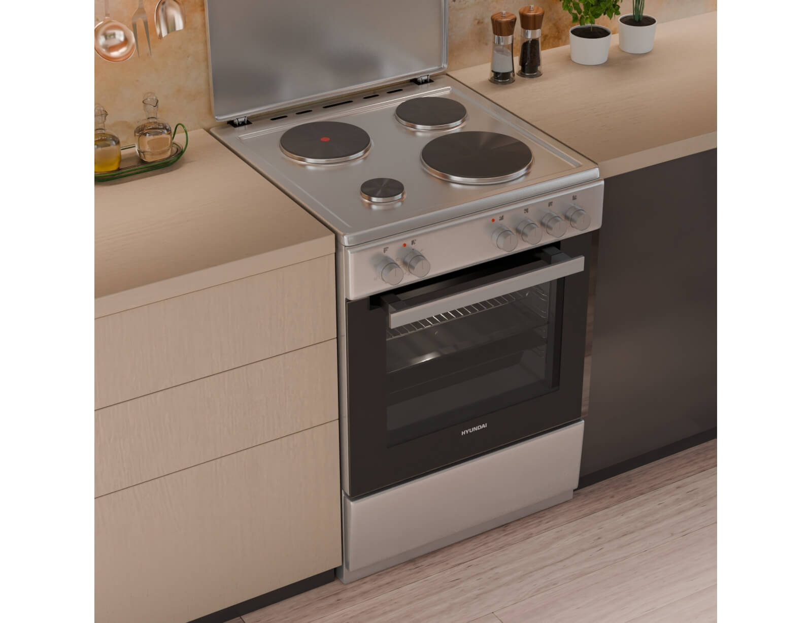 Κουζίνα Hyundai HCMU24V-7260E/S με ηλεκτρικό φούρνο, χωρητικότητα φούρνου 69 λίτρα, ενεργειακή κλάση Α, 4 εμαγιέ εστίες μαγειρέματος και 5 λειτουργίες ψησίματος.